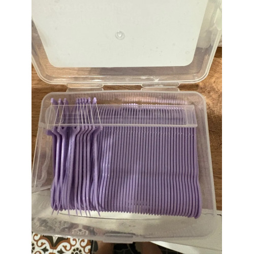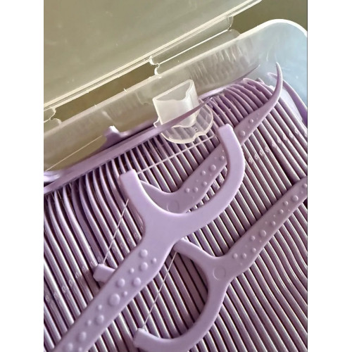 Удобные зубочистки в пластиковой коробочке для хранения. Каждая зубочистка надета на фиксирующие стержни, поэтому они лежат в коробке аккуратно. Нить на зубочистке прочная.